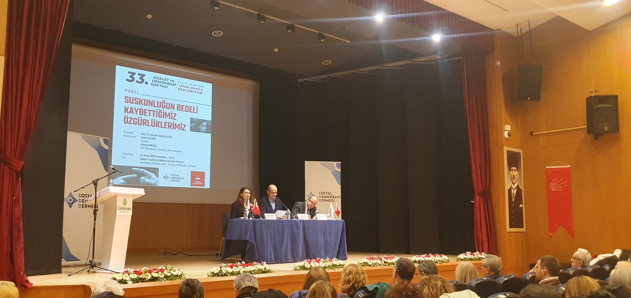 Sosyal Demokrasi Derneği olarak, 33. Adalet ve Demokrasi Haftası nedeniyle düzenleyeceğimiz etkinliklerin ilkini, CHP Çankaya İlçe Başkanlığının katkılarıyla Doğan Taşdelen Çağdaş Sanatlar Merkezi’nde gerçekleştirdik. Moderatörlüğünü SDD Yönetim Kurulu üyesi Doç. Dr. Haydar Seçkin ÇELİK’in yaptığı “Suskunluğun Bedeli Kaybettiğimiz Özgürlüklerimiz” başlıklı Panel’in konuşmacıları CHP Genel Başkan Yardımcısı Gökçe GÖKÇEN ve Gazeteci Fatih ERTÜRK oldu.